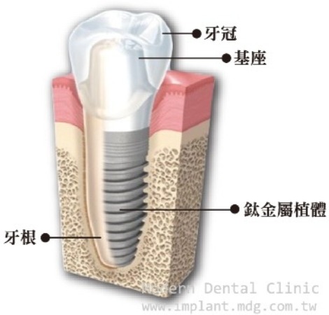 在缺牙處植入生物相容性良好的鈦金屬人工牙根,取代失去的牙根後縫合,經過幾個月後,人工牙根會與骨頭緊密結合,可以承受一般咬合的力量,才在其上方置上假牙牙冠,恢復咬合功能。 不論是剛剛失去,或是已缺牙多年,即使僅一顆牙齒而已,都會體會到也是失去身體重要的一部分。 現今人工植牙是結合醫療技術與現代科技的治療方法之一,也實現賦予我們第三套牙齒。